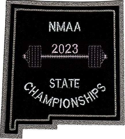 This is the souvenir letterman patch available for the 2023 NMAA State Powerlifting Championships.